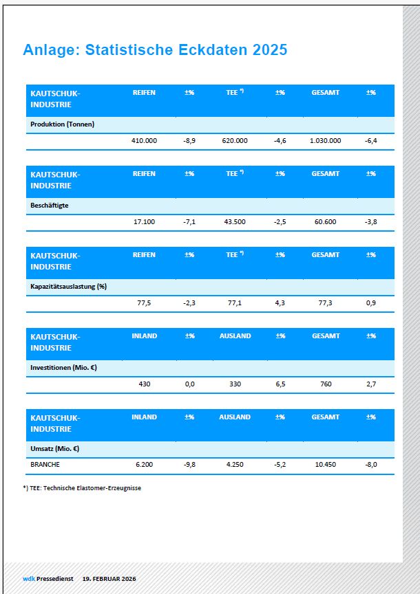 Die jüngsten Presseverlautbarungen des wdk reflektieren den Krisenmodus, in dem die deutsche Kautschukindustrie weiterhin agiert. Am 20. Februar legte wdk-Chefvolkswirt Michael Berthel ernüchternde Branchendaten für 2025 vor. Demnach gingen die Beschäftigung der Branche im fünften und die Produktion im vierten Jahr in Folge zurück. Im scharfen internationalen Kostenwettbewerb konnten sich die mittelständischen deutschen Qualitätsanbieter kaum behaupten – zu erdrückend sind die standortbezogenen Energie-, Bürokratie-, Steuer- und Arbeitskosten. Angesichts der angespannten Versorgungslage durch den Iran-Krieg wies wdk-Präsident Michael Klein in einer Pressemeldung vom 6. März auf die steigenden Energiepreise hin. Konkret wiederholte er die Forderung nach einer Streichung des Brennstoffemissionshandelsgesetzes. Mindestens, so Klein, müsse es aber temporär für den Einsatz von Brennstoffen für industrielle Prozesswärme ausgesetzt werden. Keine Krise, sondern ein einzigartiges und unverzichtbares Kautschukprodukt stand im Mittelpunkt des neuen Beitrags zur Serie "Gummi - Wir retten die Welt!" Ohne Hydraulikschläuche, die in Baggern und Baufahrzeugen unter härtesten Bedingungen ihren Dienst tun, ginge auf Baustellen nichts, wie wdk-Chefchemiker Volker Krings in der Pressemeldung vom 6. Februar anschaulich erläutert.